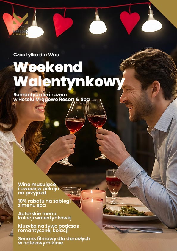 Zrób miłą niespodziankę swojej drugiej połówce i zaproś ją na Walentynkowy Weekend pełen romantycznych chwil, dźwięków, kulinarnych doznań i niezapomnianych wrażeń w naszym SPA. W Hotelu Mrągowo Resort & SPA, w otoczeniu mazurskich lasów i jezior, w komfortowych warunkach i przyjaznej atmosferze wspólnie zadbamy o Państwa romantyczny wypoczynek. Zaplanuj romantyczny weekend dla dwojga na Mazurach.