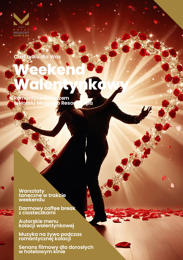 Zrób miłą niespodziankę swojej drugiej połówce i zaproś ją na Walentynkowy Weekend pełen romantycznych chwil, dźwięków, kulinarnych doznań i niezapomnianych wrażeń w naszym SPA. W Hotelu Mrągowo Resort & SPA, w otoczeniu mazurskich lasów i jezior, w komfortowych warunkach i przyjaznej atmosferze wspólnie zadbamy o Państwa romantyczny wypoczynek. Zaplanuj romantyczny weekend dla dwojga na Mazurach.